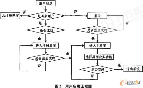 當(dāng)用戶與系統(tǒng)聯(lián)系時(shí),首先確定是否為注冊(cè)用戶,如果是注冊(cè)用戶,就可以通過客戶編碼和密碼登錄系統(tǒng),進(jìn)行業(yè)務(wù)的操作。否則,尋問用戶是否需要注冊(cè),如果客戶拒絕注冊(cè),則可以進(jìn)入一般功能界面,如公司新聞、各項(xiàng)政策等。如果客戶同意注冊(cè)并且注冊(cè)成功,那么就可以進(jìn)入系統(tǒng)業(yè)務(wù)操作流程。然后用戶搬據(jù)自身的需求,對(duì)系統(tǒng)的具體功能模塊進(jìn)行操作,以達(dá)到與企業(yè)數(shù)據(jù)庫(kù)交互目的,從而實(shí)現(xiàn)業(yè)務(wù)操作的及時(shí)性和移動(dòng)性。具體如圖2所示。