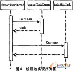 為解決頻繁創(chuàng)建線程導(dǎo)致的線程生命周期開銷和資源消耗問題,借鑒在網(wǎng)絡(luò)服務(wù)中常見的線程池技術(shù)。由于服務(wù)器需要處理大量的網(wǎng)絡(luò)請(qǐng)求,為避免大量的線程創(chuàng)建和銷毀所導(dǎo)致的問題,通常使用線程池來(lái)處理網(wǎng)絡(luò)請(qǐng)求,即在線程池中預(yù)先創(chuàng)建一定數(shù)量的線程,當(dāng)新的網(wǎng)絡(luò)任務(wù)到達(dá)時(shí),由線程池中一個(gè)空閑線程執(zhí)行該任務(wù),任務(wù)執(zhí)行完畢后該線程并不銷毀,而是重新返回線程池中并等待新的任務(wù)到達(dá)。對(duì)于J2ME設(shè)備需要頻繁連接網(wǎng)絡(luò)的情況下,線程池不失為一個(gè)提高性能、節(jié)約系統(tǒng)資源的好方法。圖4給出了線程池實(shí)現(xiàn)的序列圖。