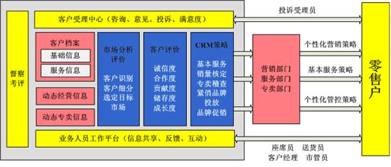 煙草行業(yè)的CRM項目是建立在煙草行業(yè)獨特的業(yè)務(wù)流程和特點之上的。在煙草行業(yè),CRM系統(tǒng)往往并不是作為一個獨立的系統(tǒng)存在,而是要與營銷系統(tǒng)、專賣系統(tǒng)等緊密聯(lián)系,形成相互共享資源的一個整體。因此,煙草行業(yè)CRM業(yè)務(wù)模型(如圖)要根據(jù)企業(yè)的經(jīng)營目標(biāo)、任務(wù)、市場管理的工作需要,為營銷、服務(wù)和專賣等部門制定營銷策略、服務(wù)策略和管控策略。