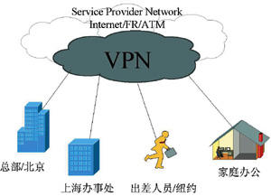在如圖2所示的VPN 示意圖中,可以看出,VPN所賴(lài)以運(yùn)行的公網(wǎng)平臺(tái)可以包括各種實(shí)際的網(wǎng)絡(luò),例如IP網(wǎng)、幀中繼網(wǎng)、ATM網(wǎng),也可以就是因特網(wǎng)(Internet),因而也表明其網(wǎng)絡(luò)的范圍可以包括多個(gè)服務(wù)商。從地理范圍上看,VPN可以延伸到所有互相聯(lián)網(wǎng)的服務(wù)商所覆蓋的范圍。從用戶接入方式看,VPN可以包括服務(wù)商所提供的所有接入方式,如專(zhuān)線接入、撥號(hào)接入、無(wú)線連接等。