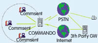 COMMANDO系統(tǒng)提供與其他同類系統(tǒng)之間的互連互通功能,通過選擇不同的模塊可以輕松實現(xiàn)與CISCO、CLARENT、COMMSENT、WHEREVER等VoIP系統(tǒng)之間的無縫銜接。