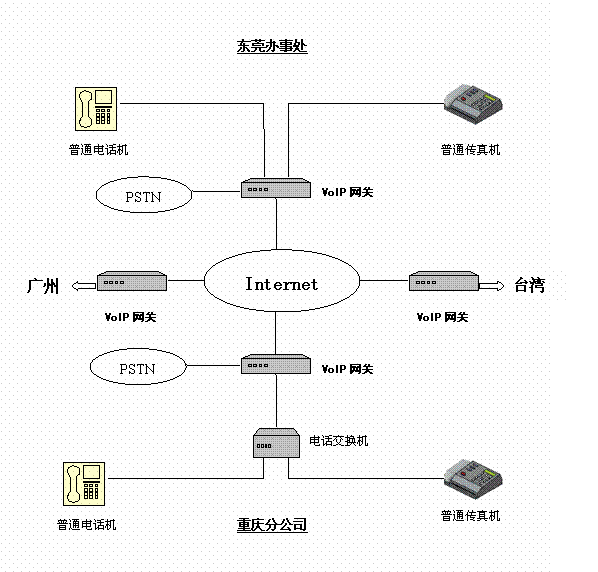 有一家臺商公司,在臺灣、東莞、廣州和重慶自己的分支機構(gòu),相互之間有大量的通話聯(lián)系,特別是研發(fā)部門,其通話量更是非常大。因此試圖在各個地方之間使用IP電話來降低通訊支出。在實施IP電話服務之前,各個地方都擁有完善的局域網(wǎng),并且申請了固定IP的寬帶接入。并且在辦公室內(nèi)部署了程控電話交換機。