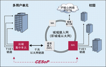 對于擁有眾多用戶的樓宇或校園業(yè)務(wù),運營商可能需要在靠近客戶的地方裝設(shè)遠端集中器。遠端集中器集中提供給該樓宇內(nèi)客戶的TDM和/或分組業(yè)務(wù),使用電路仿真并通過點到點連接將業(yè)務(wù)傳回最近的城域網(wǎng)絡(luò)接入點。