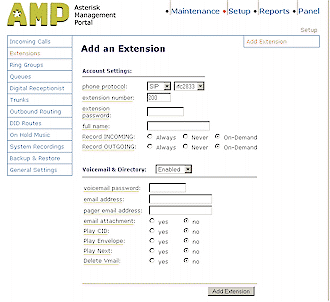 設(shè)置好中繼后,現(xiàn)在AAH就與你的VoIP服務(wù)提供商建立好連接了,接下來就是使用“Add an Extension”頁面(圖5)來設(shè)置你的電話了,每一個Extensions選項必需指定一個名字、數(shù)字和密碼,還可隨意給它指定一個語音信箱的目錄。