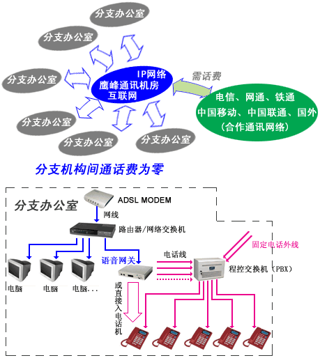 針對(duì)以上現(xiàn)狀,鷹峰NGN組網(wǎng)方案協(xié)助A公司在中國總部進(jìn)行了周密的分析與考察并就相關(guān)的產(chǎn)品技術(shù)進(jìn)行了深入的研究與探討,提供了以A公司在中國現(xiàn)有數(shù)據(jù)專網(wǎng)為基礎(chǔ)的,融合語音通信的解決方案,這是一套充分利用A公司現(xiàn)有數(shù)據(jù)網(wǎng)絡(luò)資源優(yōu)勢,可行、先進(jìn)、完整的企業(yè)VoIP通信解決方案。將最終以A公司目前在中國所有機(jī)構(gòu)為結(jié)點(diǎn),組成在中國的VoIP網(wǎng)絡(luò)。方案匯集了鷹峰通訊所有最新PBX/語音網(wǎng)關(guān)及網(wǎng)絡(luò)通訊技術(shù)及設(shè)備,保護(hù)了原有的交換機(jī)資源,不改變撥號(hào)習(xí)慣,體現(xiàn)了非?捎^的經(jīng)濟(jì)效益,并且實(shí)現(xiàn)了快速實(shí)施,將投入的時(shí)間,資金縮到了最小。