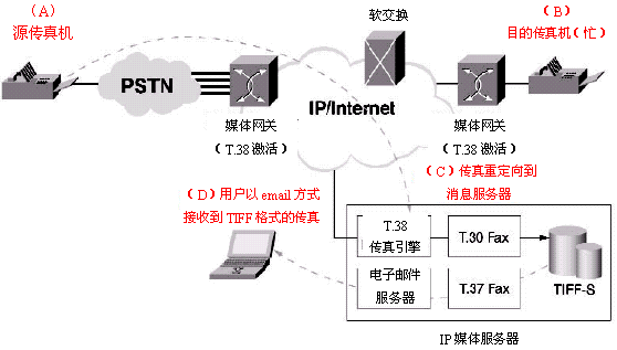 T.38規(guī)定了實(shí)時(shí)IP傳真的標(biāo)準(zhǔn)。因此,源于PSTN的一個(gè)傳真會(huì)話能夠以T.38的格式進(jìn)入IP網(wǎng)絡(luò)。在IP媒體服務(wù)器中通過使用T.30,T.38和T.37,實(shí)時(shí)傳真會(huì)話可以把IP媒體服務(wù)器作為終端,并把實(shí)時(shí)傳真轉(zhuǎn)換成T.37兼容的傳真消息。然后,這個(gè)傳真消息會(huì)被用來產(chǎn)生一個(gè)就象一個(gè)電子郵件會(huì)話的T.37傳真。這使得IP媒體服務(wù)器可以提供"永不示忙"的IP傳真功能。這個(gè)功能也將為統(tǒng)一消息應(yīng)用提供基于IP的傳真郵箱能力。