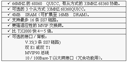 TX3000卡的功能大致和TX2000卡相同,但它比TX2000的性能2.5至5倍。TX3000卡上有一個(gè)66MHZ的68060協(xié)處理器。TX3000卡為SS7應(yīng)用配置1至4個(gè)QUICC通信控制器,最多16條信令鏈路,提供一個(gè)三口V.35,擁有雙T1或雙E1接口。(主板上標(biāo)準(zhǔn)配置一個(gè)QUICC,支持四條SS7鏈路,當(dāng)CT總線和串行接口都要使用,或者處理的鏈路超過(guò)4條時(shí),可先配置有三個(gè)QUICC的背板,四個(gè)QUICC可支持16條SS7鏈路)。