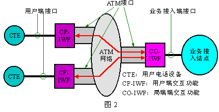 下圖2是VoATM的參考模型。其中的CTE為用戶電話終端設(shè)備,“業(yè)務(wù)接入結(jié)點(diǎn)”是指用戶電話業(yè)務(wù)的提供網(wǎng)絡(luò)在ATM網(wǎng)絡(luò)側(cè)的界;其中的CP-IWF完成用戶電路和ATM網(wǎng)絡(luò)的協(xié)作功能,而CO-IWF則完成ATM網(wǎng)絡(luò)和業(yè)務(wù)網(wǎng)絡(luò)的協(xié)作功能。