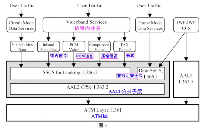 話帶業(yè)務(wù)包括標(biāo)準(zhǔn)PCM、壓縮語音和FAX等。它們?cè)贏TM網(wǎng)絡(luò)的傳輸主要有兩種方式:LES和VoIP/AAL5/ATM。