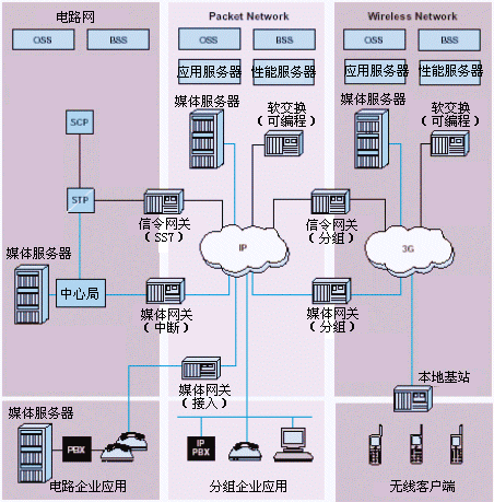 - 特征服務(wù)器--從現(xiàn)有電路交換網(wǎng)絡(luò)實(shí)現(xiàn)信號控制點(diǎn)(SCP)業(yè)務(wù)以及由本地交換和接入?yún)R接交換機(jī)提供的高級業(yè)務(wù)。