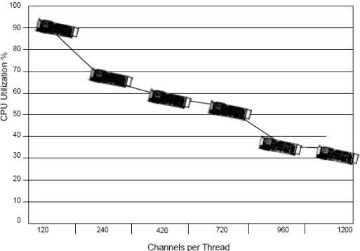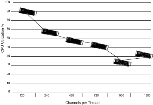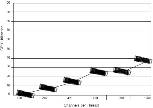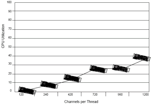圖 3 顯示了運行的線程數(shù)和不同的CPU使用率. 當有多個一個線程運行的時候, 每個線程處理一定的負荷. 例如, 如果有兩個線程運行, 每個處理600個同時的放音.