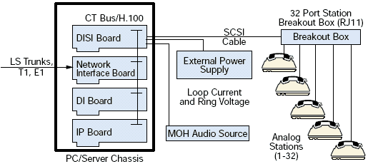 DISI16R2, DISI24R2, 和 DISI32R2 可以通過(guò)CTbus與其他集成的網(wǎng)絡(luò)接口和資源板卡連接構(gòu)成可擴(kuò)展的中繼和座席交換的配置. 這些板卡也與Dialogic的IP板卡兼容,可以被用來(lái)做VoIP應(yīng)用, 請(qǐng)參考圖1.